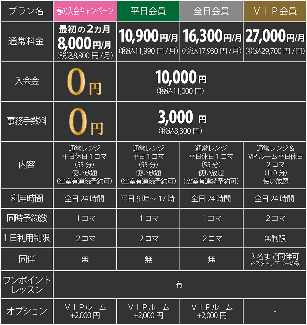 通常レンジ&VIPルーム平日休日2コマ(110分)使い放題(空きあり連続予約可)